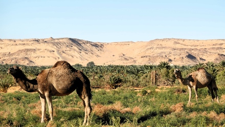 Today we drive across the fields of Qasaa to our nearby camel farm, where you can experience the good-natured black camels of Bahariya up close. Afterwards, a short drive leads to Gebel Dist and Maghrafa - the “pot mountain” and “ladle mountain”, landmarks of the area. The route continues off-road through the palm gardens towards the old oasis capital of el Qasr. Picnic lunch on the way at a panoramic point with a view over the old settlement and the palm trees of the oasis. Once in El Qasr, visit the small museum where some of the “Golden Mummies” are on display, as well as the tomb of Panentiu and his father at Qaret Selim. The day ends with a stroll through the market and a visit to a café. Overnight stay in the oasis of Qasaa. (BLD)