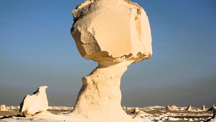 Departure through the desert in the morning, past Bir Matar to the southwest; the Bir Matar well (“airport well”) was a heliport during the Second World War.The lesser-known rock formations of the Black Desert are located here.Shattered granite massifs are covered in light-colored drifting sand, most picturesquely seen at Gebel Marsus. From the Black Desert, the route continues south to the El Heiz depression, one of the small oases that form Bahariya. El Heiz was inhabited in Greco-Roman times.During the heyday of Coptic Christianity, there was a church here, an impressive monastery complex and numerous houses and farm buildings.The remains of a qasr or watchtower indicate a military garrison.From El Heiz it is only a short distance to the famous White Desert.Limestone formations carved by the wind appear as animal figures or mushrooms and give the landscape the appearance of a glacier.Overnight stay in a hotel in Farafra.(BLD)